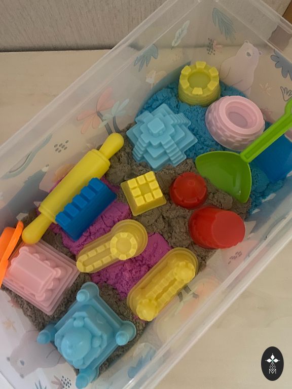 Komplektā 1 kg kinētisko smilšu 3 krāsās un smilšu formiņas.